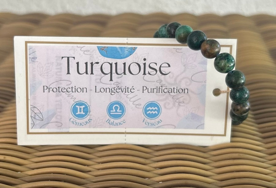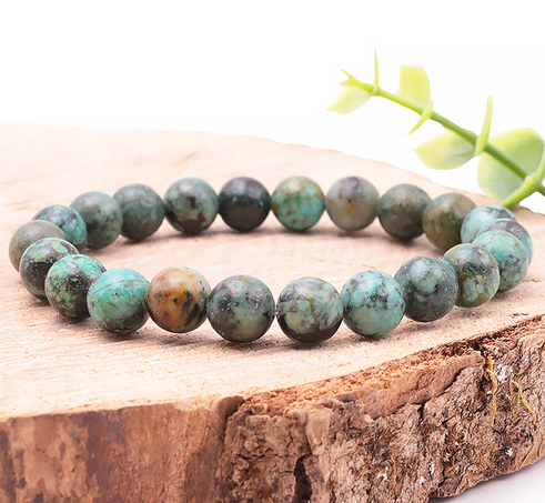 Plongez dans les nuances profondes et mystĂ©rieuses de la Turquoise dâAfrique, une pierre aux couleurs oscillant entre le vert intense et le bleu profond. Ce bracelet en perles de 08 mm incarne Ă la fois lâĂ©lĂ©gance, lâauthenticitĂ© et lâaventure.