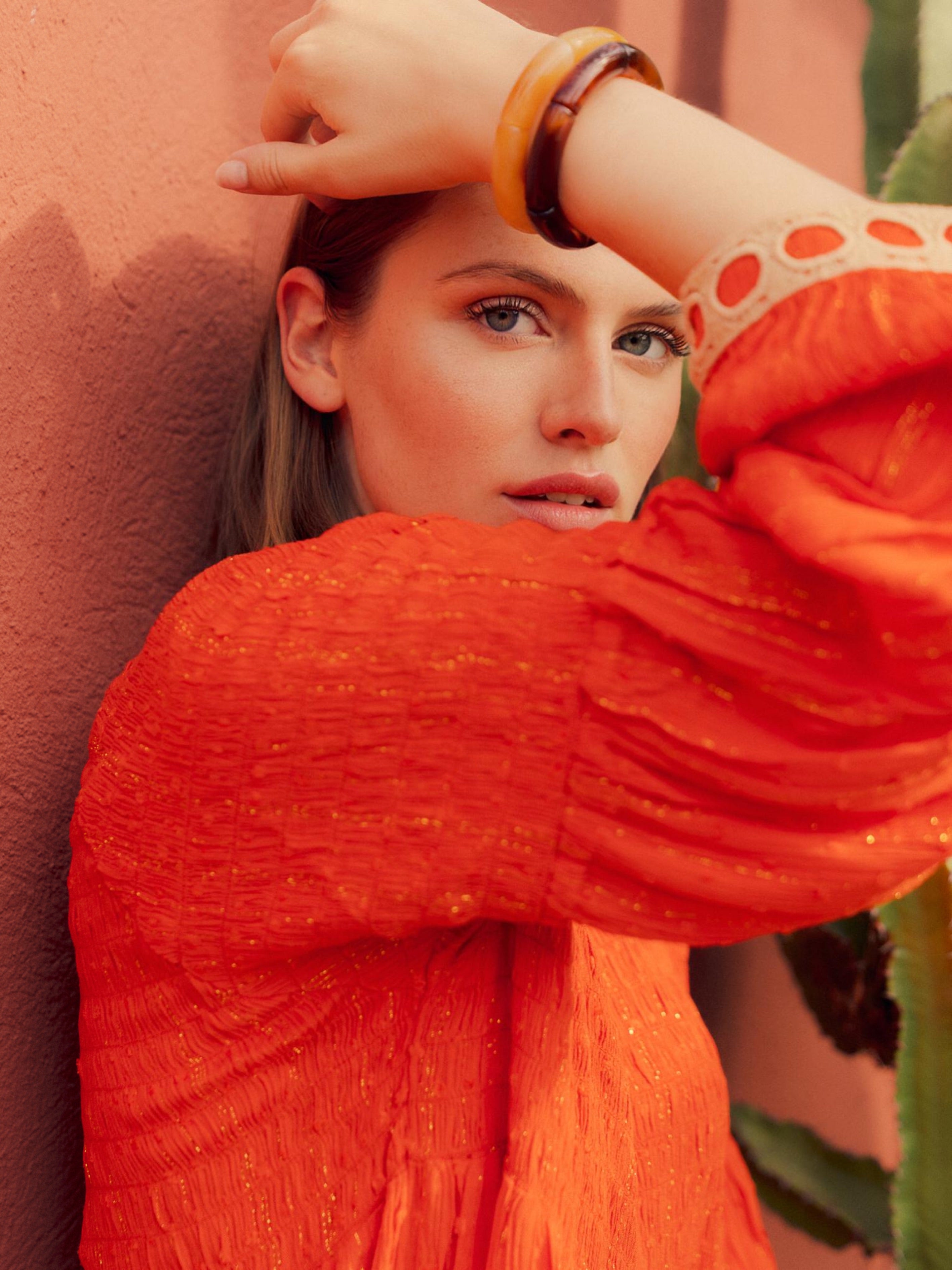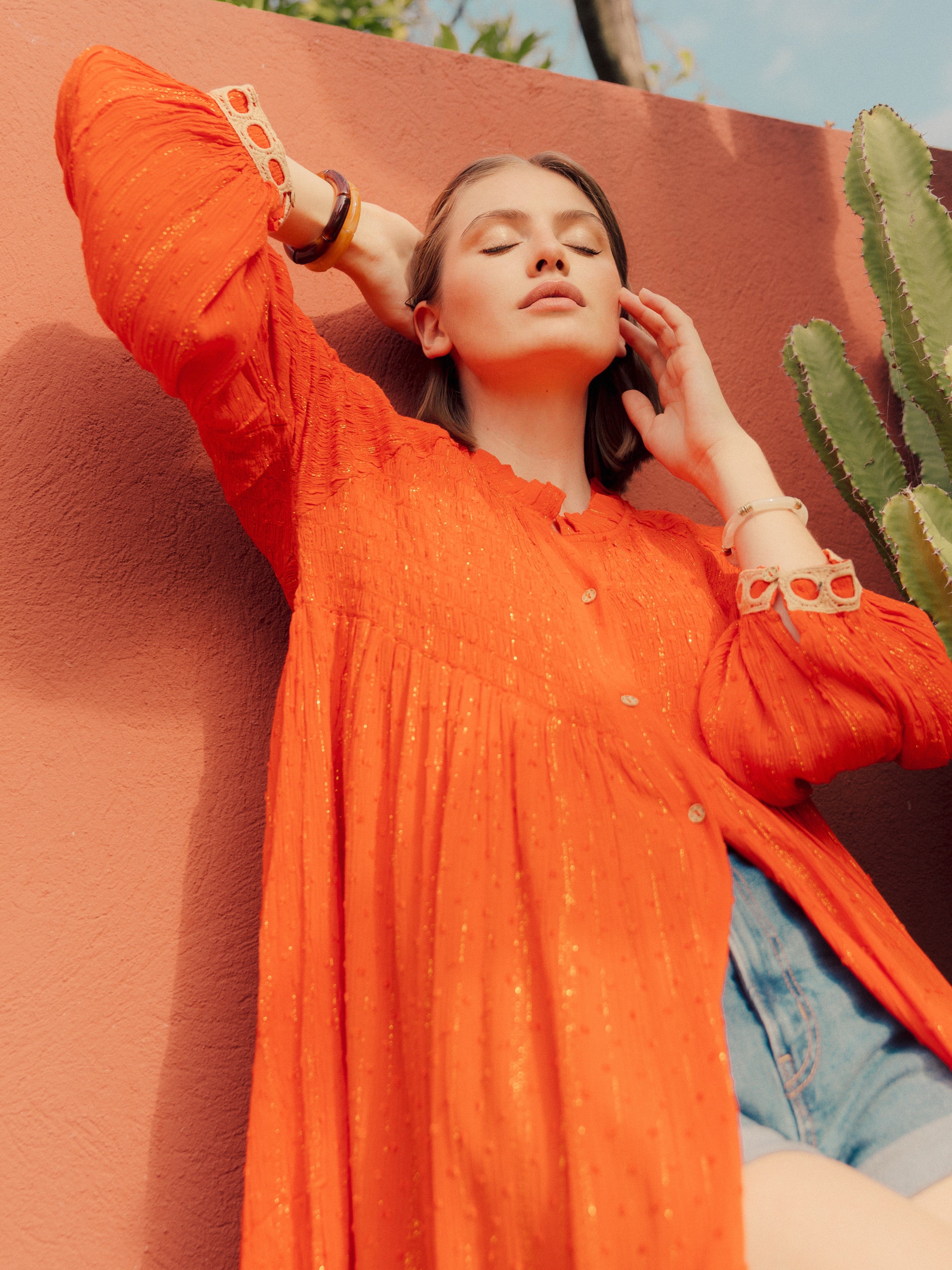 En viscose soyeuse et lurex doré 🌿🌟, elle allie fluidité, confort et brillance subtile.