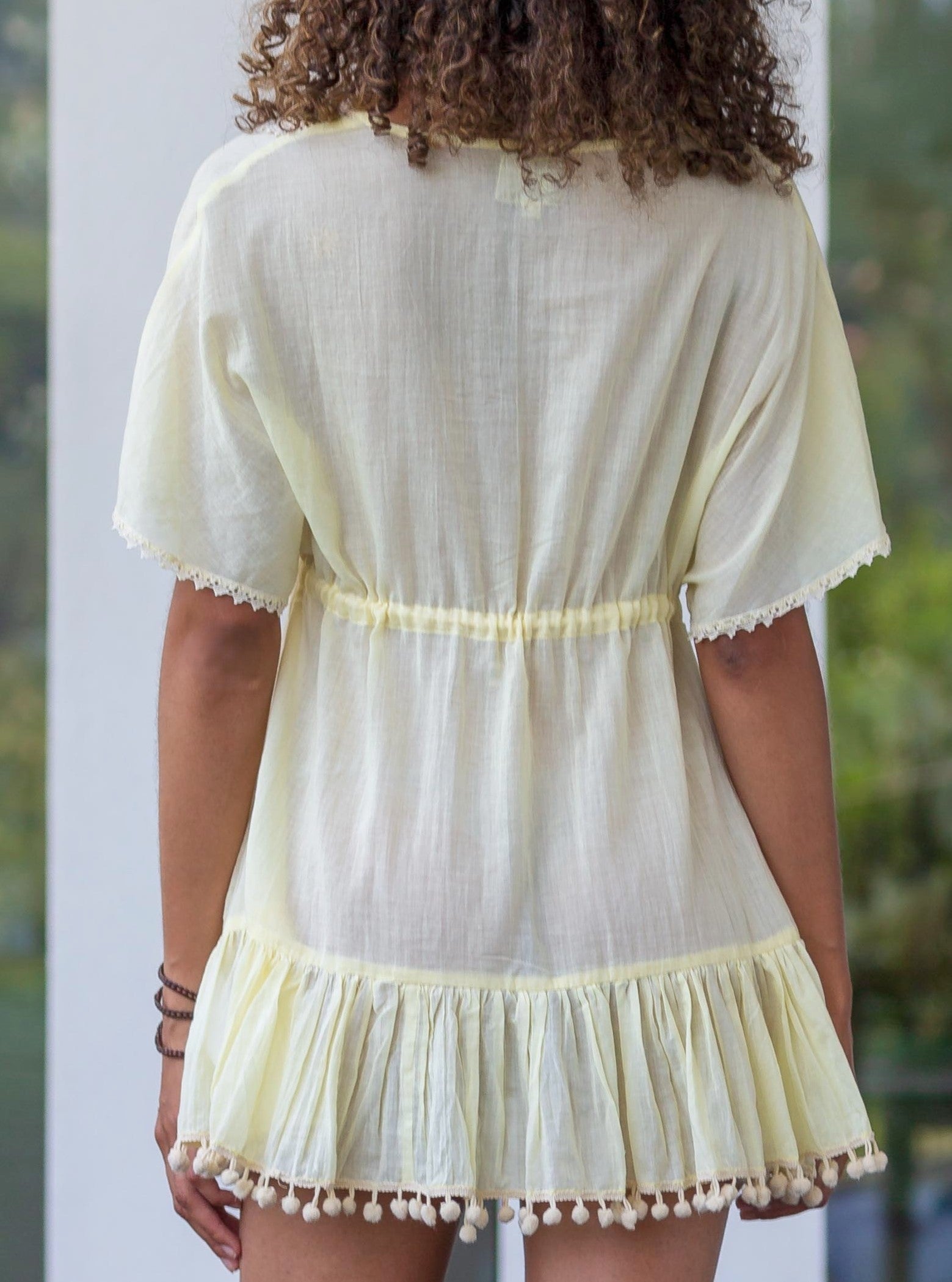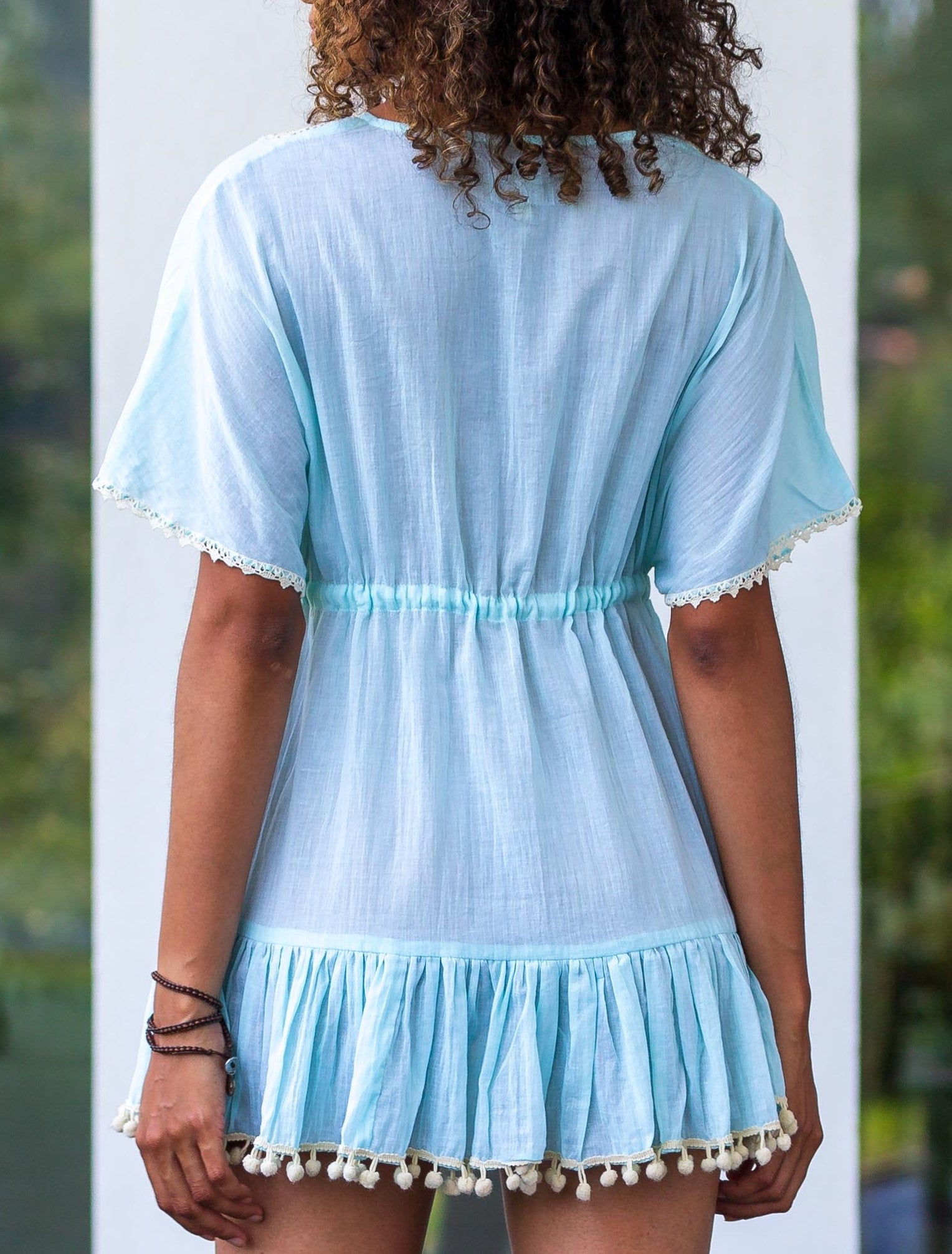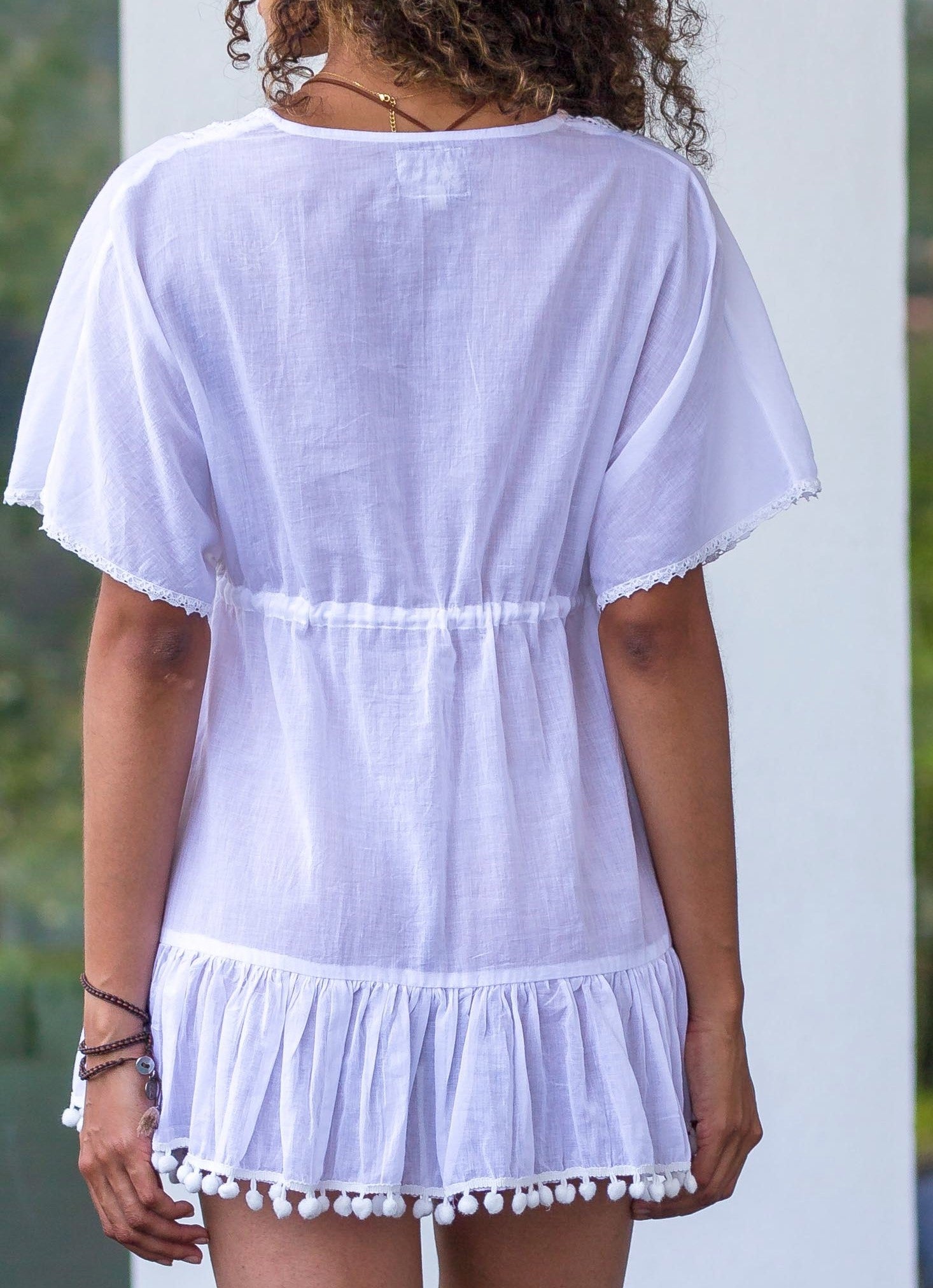 🎀 Le lien ajustable sous la poitrine, rehaussé de pompons fantaisie 🎐, permet un tombé parfait et féminin, quelle que soit votre silhouette.