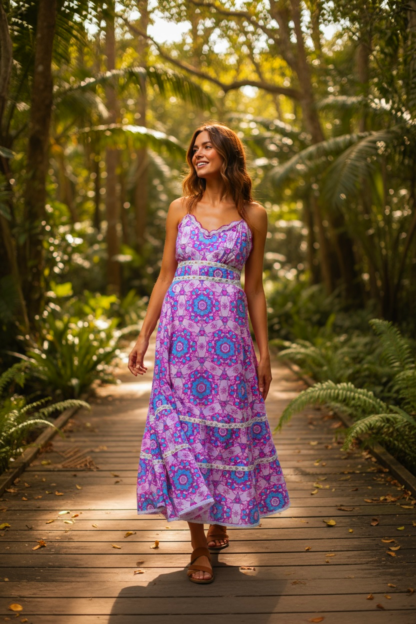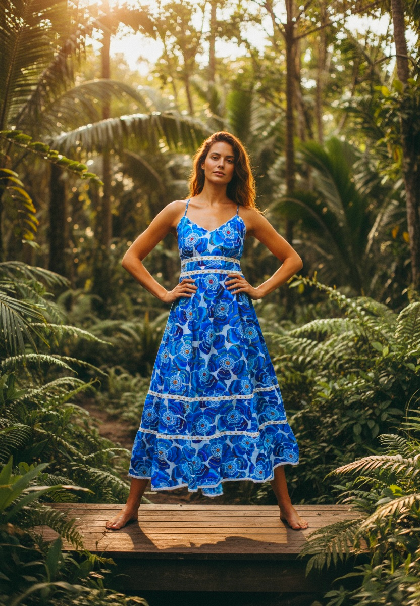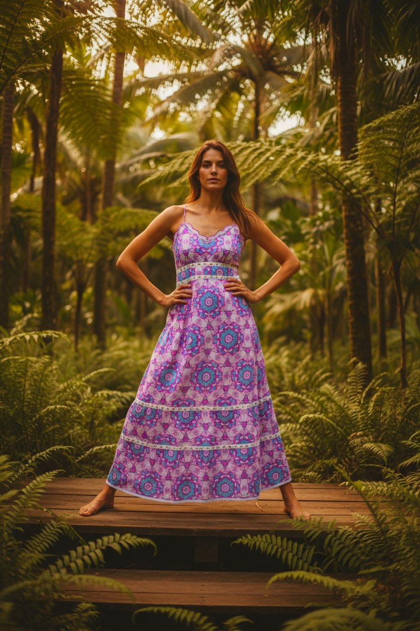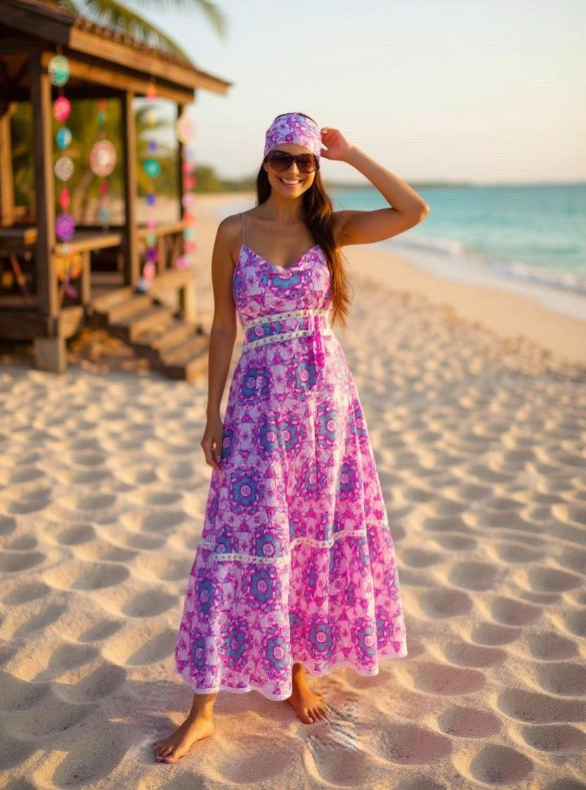 Imprimé floral mandala ✨, détails dorés et passementeries raffinées 🌞. Bretelles fines, dos nu et laçage ajustable 💫 : cette robe sublime la silhouette avec légèreté et sensualité.