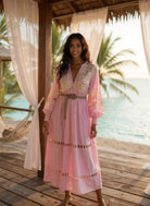 Son lien coulissant sous la poitrine 🎀 assure un ajustement parfait, tandis que ses manches smockées et ses détails ajourés 🌿 apportent une touche artisanale chic et bohème.