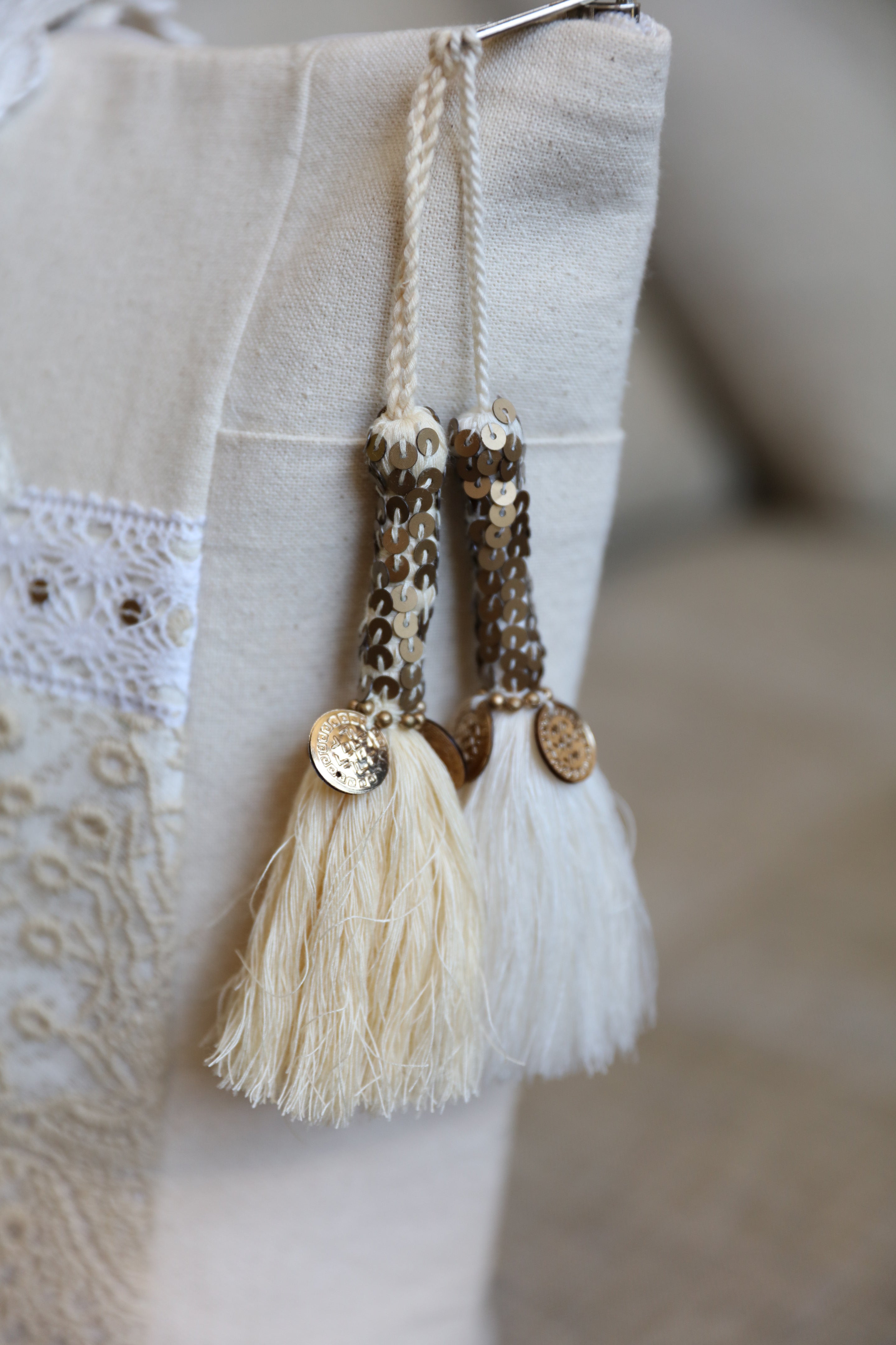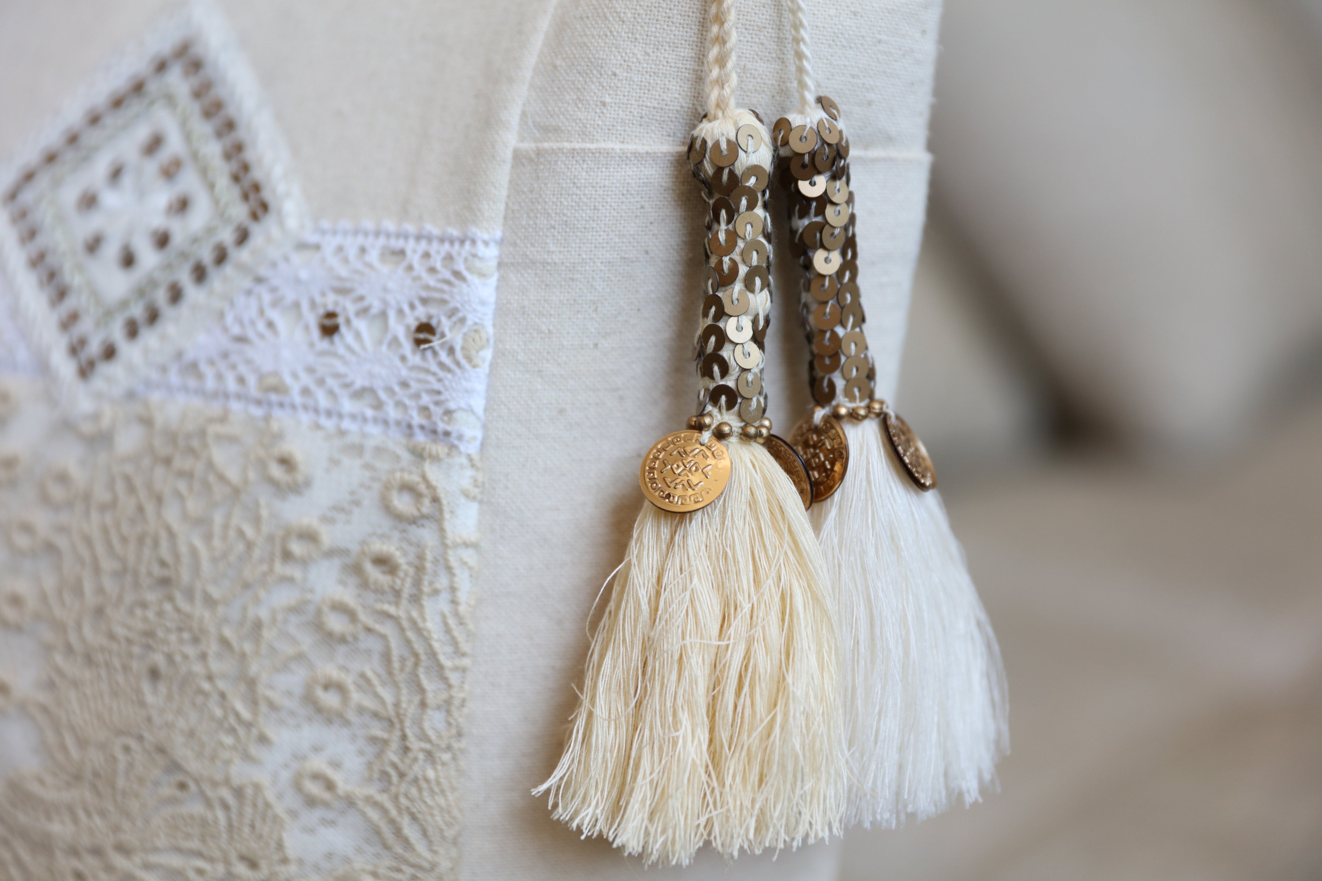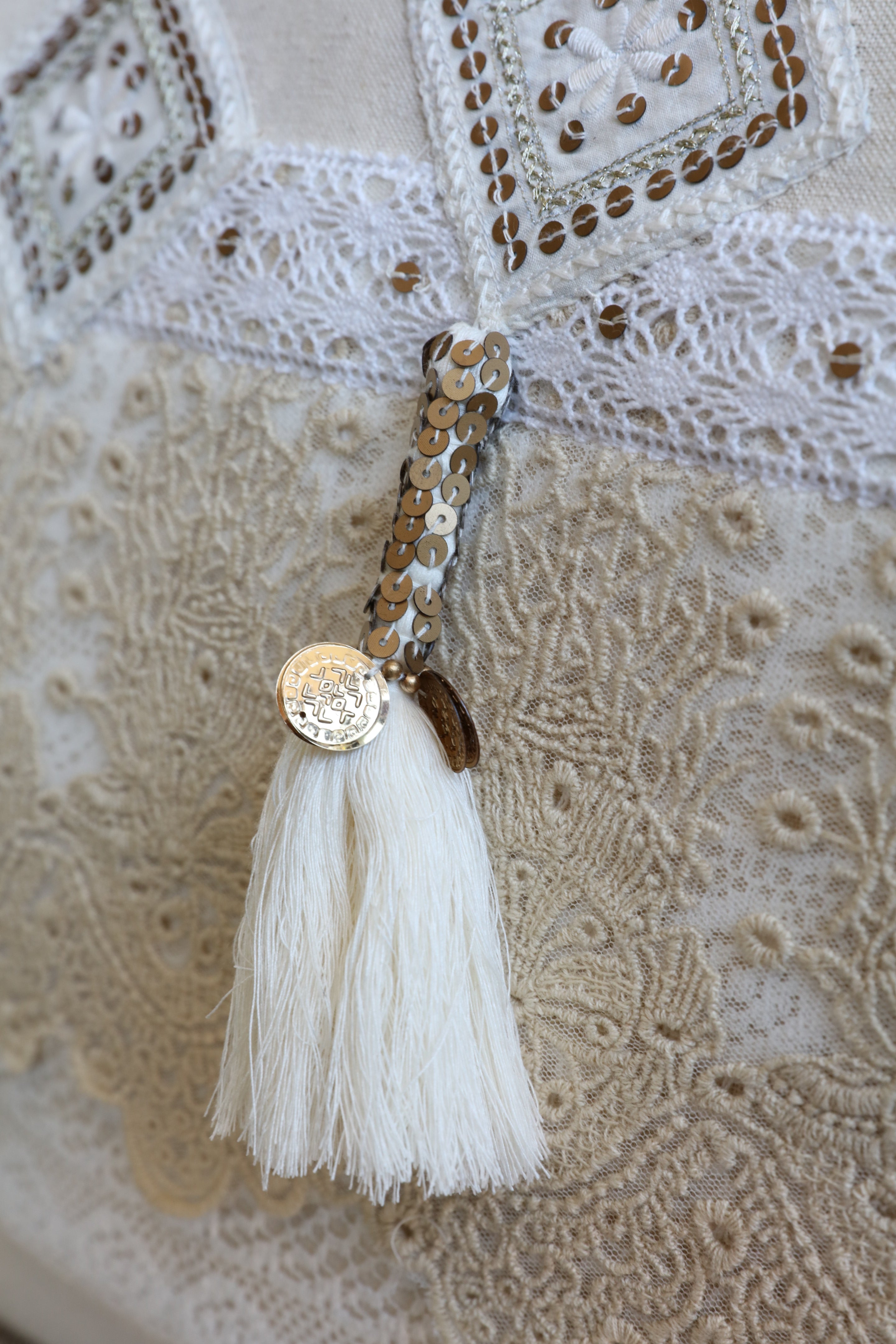 Un bijou entre tradition et modernité 💎 ! Ce modèle séduit par ses broderies fines, sa dentelle délicate et ses sequins scintillants pour une allure élégante et féminine 🌸. Les patchs artistiques et la fermeture à pompons colorés rehaussée de pièces métalliques apportent une touche chic et fantaisiste ✨