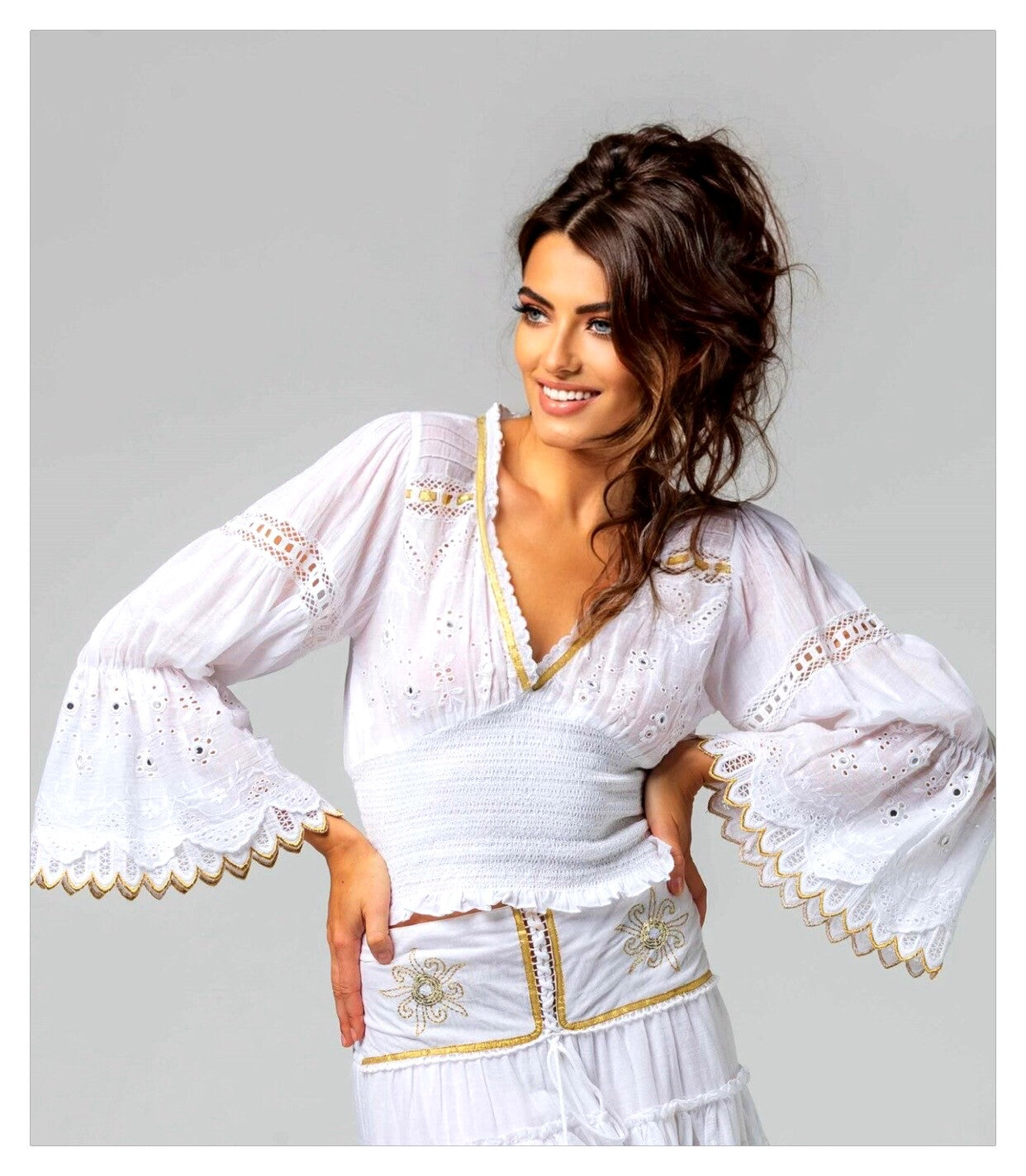 Laisse-toi séduire par ce top en coton brodé 🧵, sublimé de miroirs scintillants ✨ et de liserés dorés 🌟 qui captent la lumière à chaque mouvement.