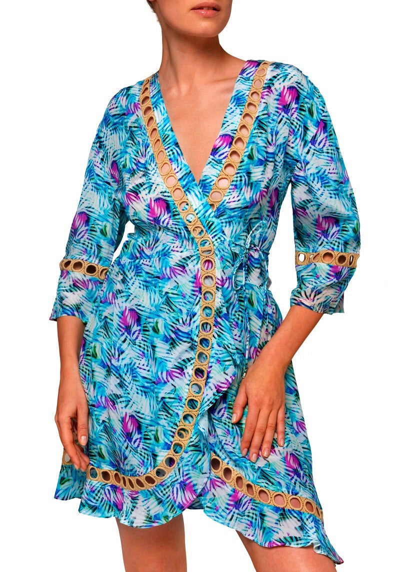 Coupe portefeuille flatteuse 💃, manches 3/4 légères 🌿 et passementerie bronze pour une touche chic 🪙.