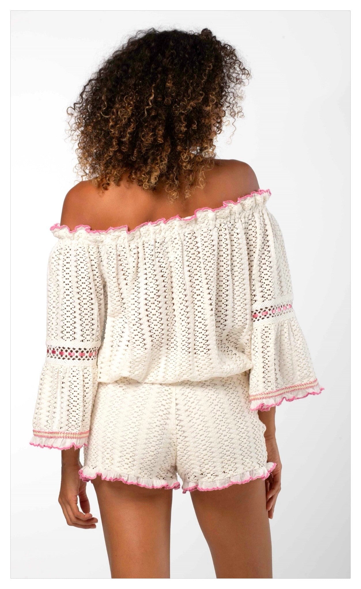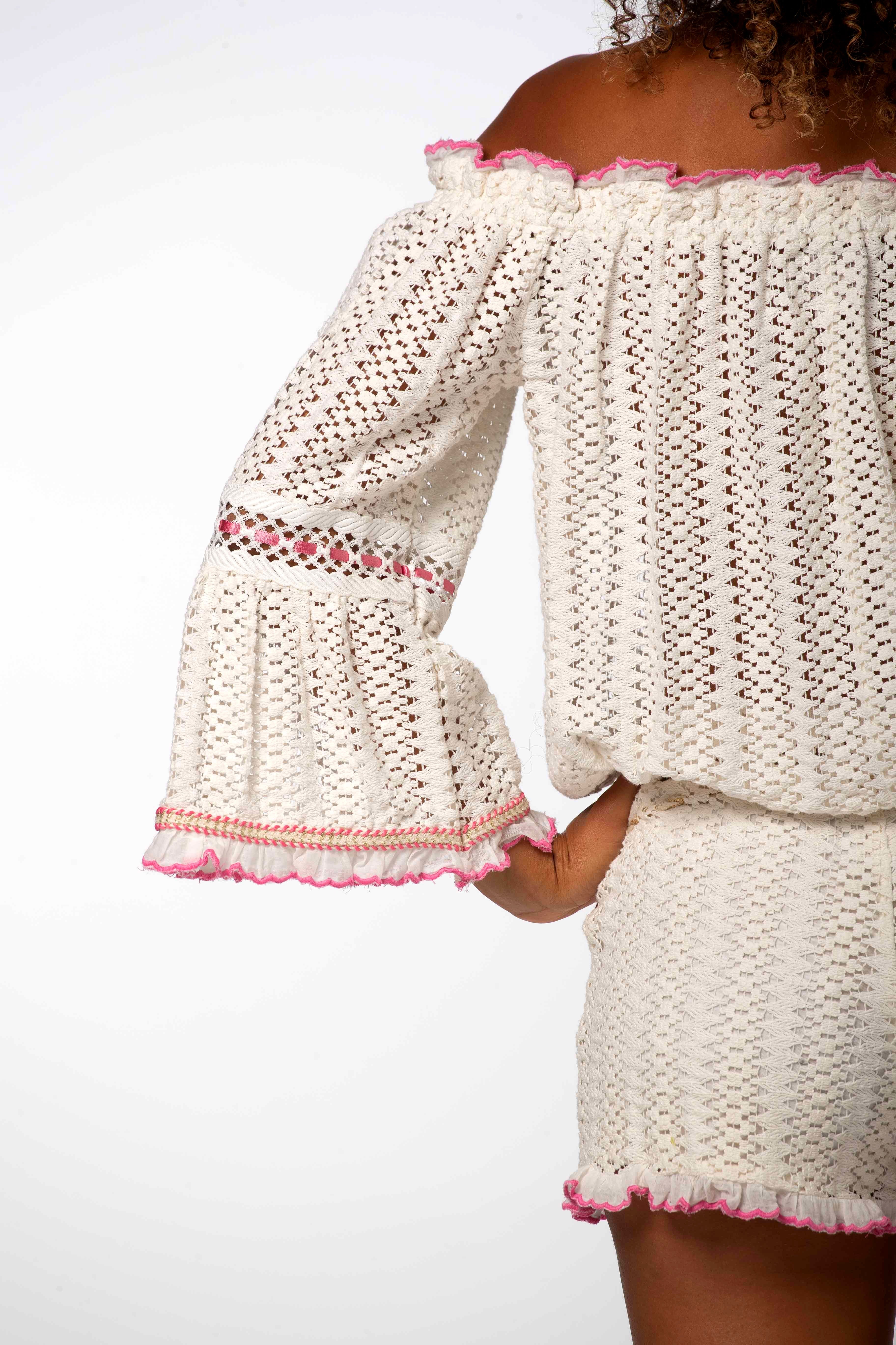 Les détails en dentelle, la surpiqûre rose et les passementeries dorées apportent une touche de raffinement et de glamour. Idéal pour la plage ou la ville, il s’associe aussi bien à un top fluide qu’à une blouse légère.