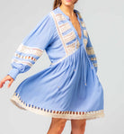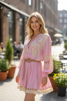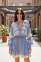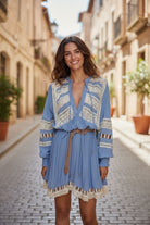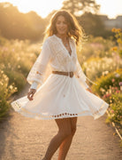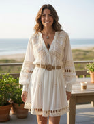 ✨ Les détails précieux – passementeries ajourées, manches smockées 🤍 et col V orné de cordons délicats 🎋 – insufflent à cette robe une allure bohème et féminine irrésistible.